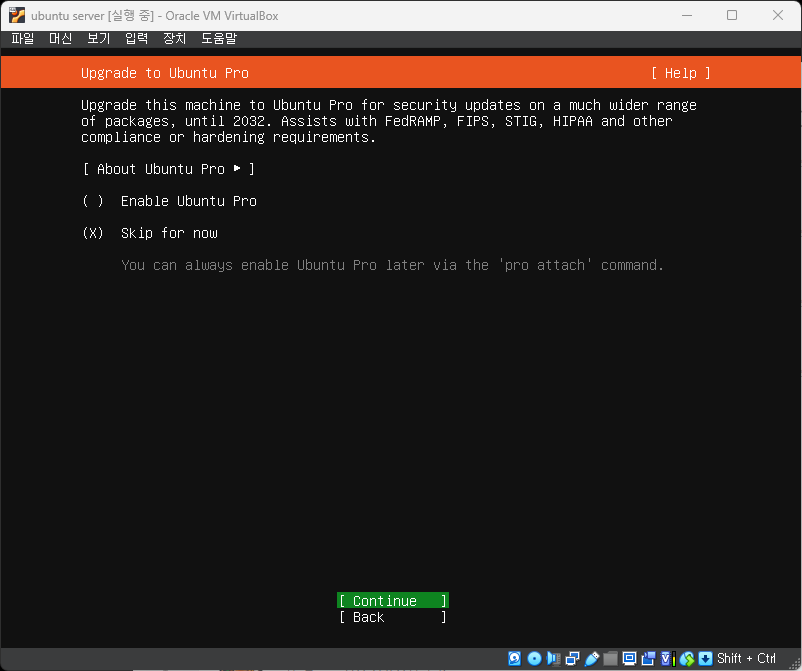 - 나는 continue를 선택 ubuntu pro로 업그레이드 할것인지를 물어보는 화면이 나왔다! 나는 우선 리눅스 공부와 만들어본 자바 웹 프로그램 배포가 목적이기 때문에 skip 선택