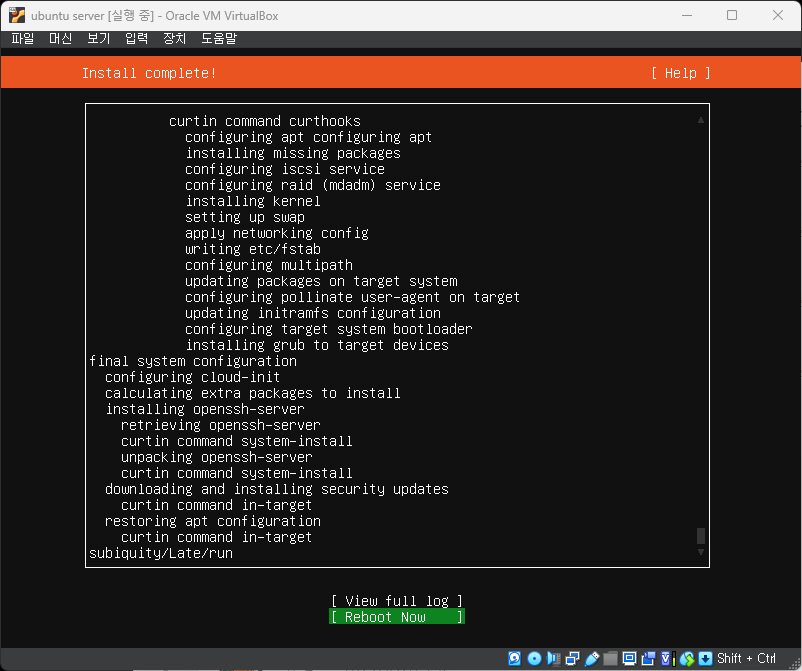 - 설치 완료 문구가 상단에 뜨면 reboot now 진행