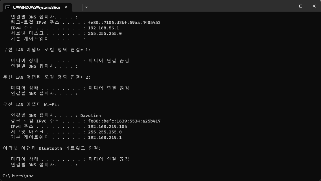 win+r->cmd입력 ->ipconfig입력(windows) -> 무선 Lan 어댑터 wi-fi 부분의IPv4주소 확인