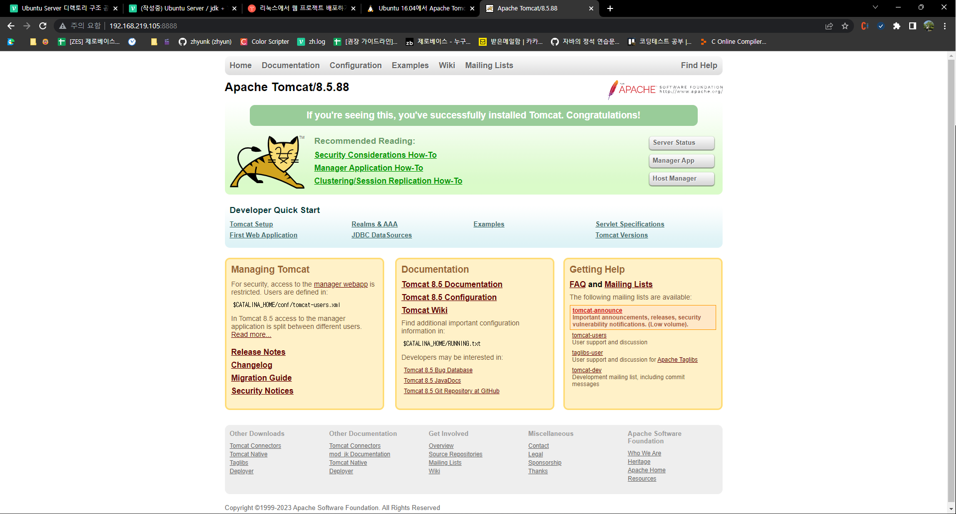 wget https://dlcdn.apache.org/tomcat/tomcat-8/v8.5.88/bin/apache-tomcat-8.5.88.tar.gz다운받은 파일의 압축을 해제한다.
