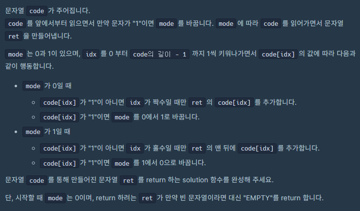 class Solution { public String solution(String code) { String answer = ""; int mode = 0; for (int i = 0; i < code.length(); i++) { if (code.charAt(i) == '1') mode = 1 - mode; else if (i % 2 == mode) answer += code.charAt(i); } return "".equals(answer) ? "EMPTY" : answer; } }조건 1.