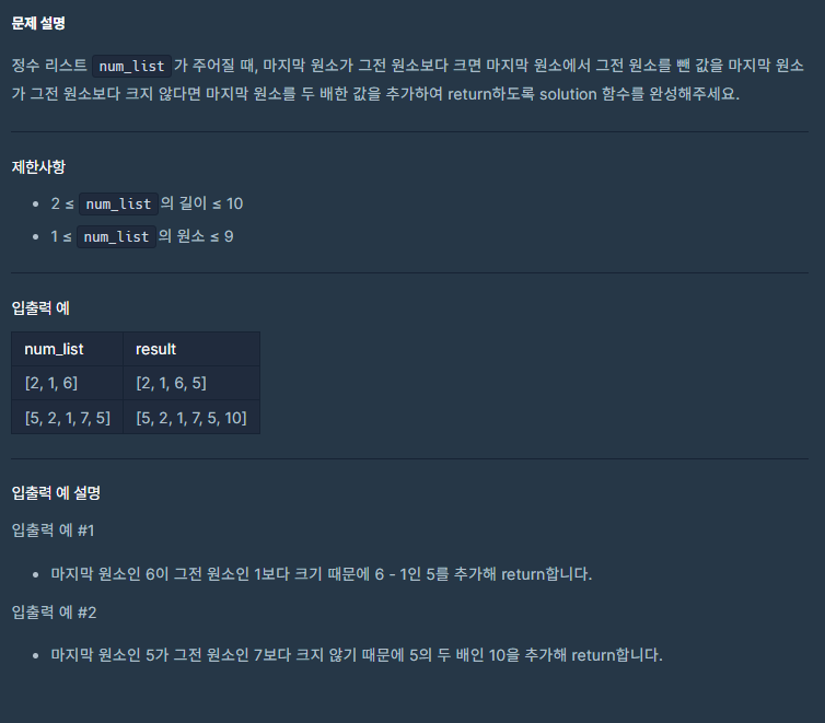 프로그래머스: 마지막 두 원소코딩테스트 문제 풀이/프로그래머스 2023. 11. 27. 00:01
