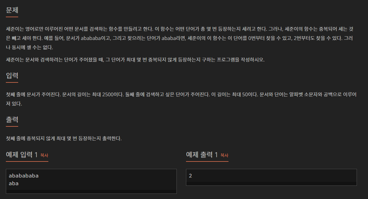 import java.util.Scanner; public class Main { public static void main(String[] args) { Scanner scan = new Scanner(System.in); String a = scan.nextLine(); String b = scan.nextLine(); int cnt = 0; while (a.contains(b)) { cnt++; a = a.replaceFirst(b, " "); } System.out.println(cnt); } }String 클래스에서 제공하는 replaceFirst()를 활용해서 풀이!