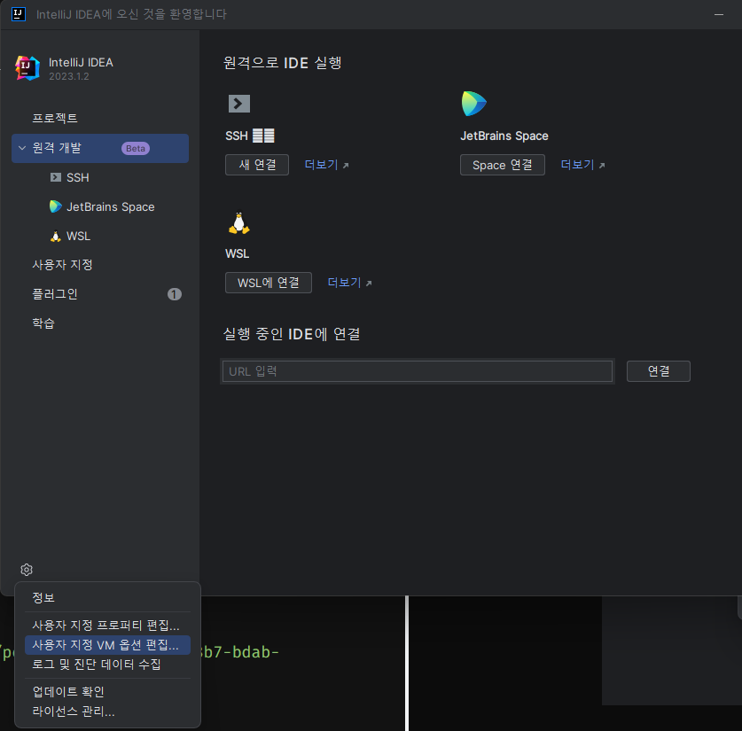 - 프로젝트 선택창 왼쪽 하단에 있는 설정 아이콘 클릭