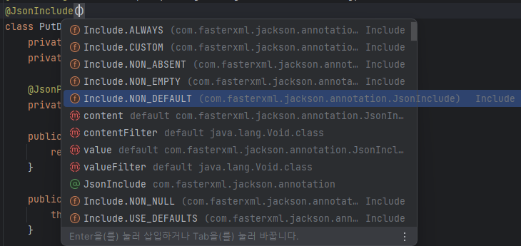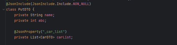 @JsonNaming(value = PropertyNamingStrategies.SnakeCaseStrategy.class) @JsonInclude(JsonInclude.Include.NON_NULL) class PutDTO { private String name; private int abc; @JsonProperty("_car_list") private List<CarDTO> carList; public String getName() { return name; } public void setName(String name) { this.name = name; } public int getAbc() { return abc; } public void setAbc(int abc) { this.abc = abc; } public List<CarDTO> getCarList() { return carList; } public void setCarList(List<CarDTO> carList) { this.carList = carList; } @Override public String toString() { return "PutDTO{" + "name='" + name + '\'' + ", abc=" + abc + ", carList=" + carList + '}'; } }2. json 값 받아올 때 null, not null, not empty 등등 관련 설정