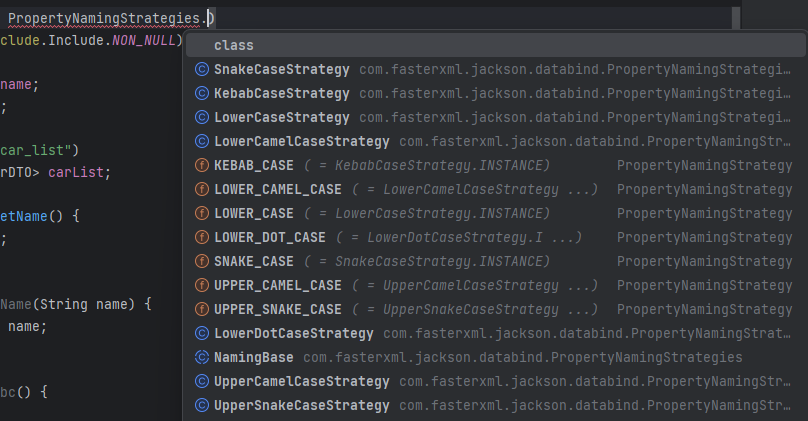 PropertyNamingStrategies.+ Ctrl + Space 입력 해서 보면 된다.PropertyNamingStrategies 클래스에서 다양한 형태의 네이밍 변환 클래스를 제공한다.