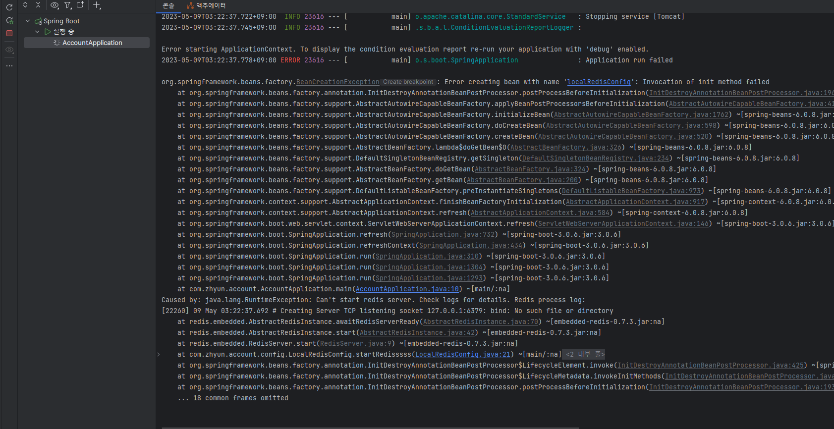 Caused by: java.lang.RuntimeException: Can't start redis server. Check logs for details. Redis process log: [22260] 09 May 03:22:37.692 # Creating Server TCP listening socket 127.0.0.1:6379: bind: No such file or directory요거다.