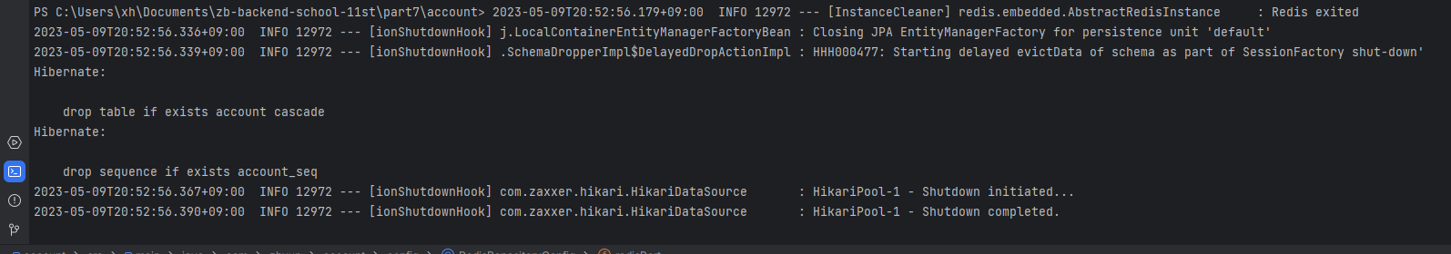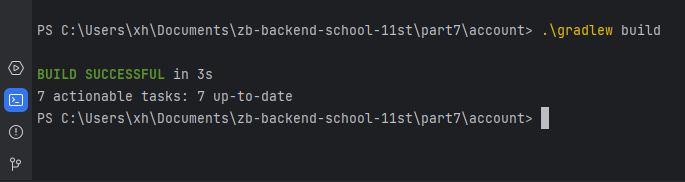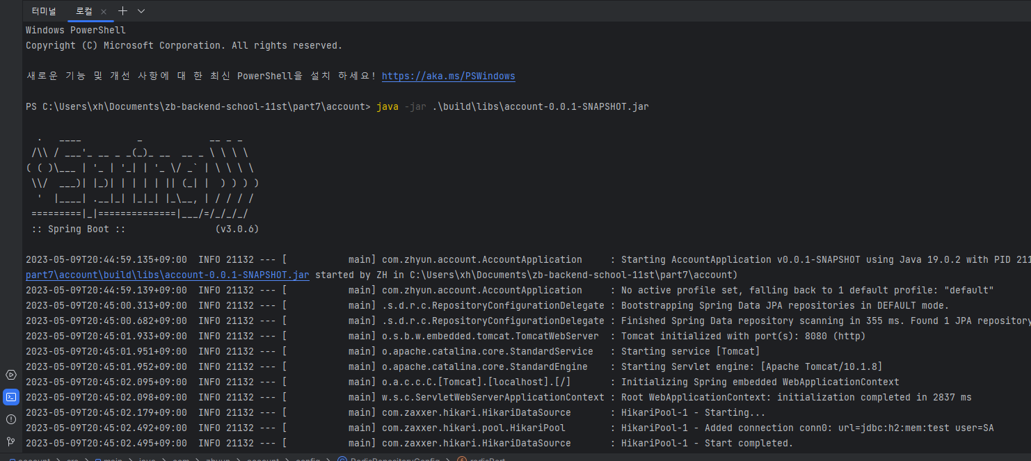 > java -jar .\build\libs\account-0.0.1-SNAPSHOT.jar이 부분은 컴퓨터 처음 부팅하고 인텔리제이 실행 했을때만 입력해주면 두 번째부터는 방향키로 명령어 재실행 할 수 있어서 괜찮은것 같다. 🤔