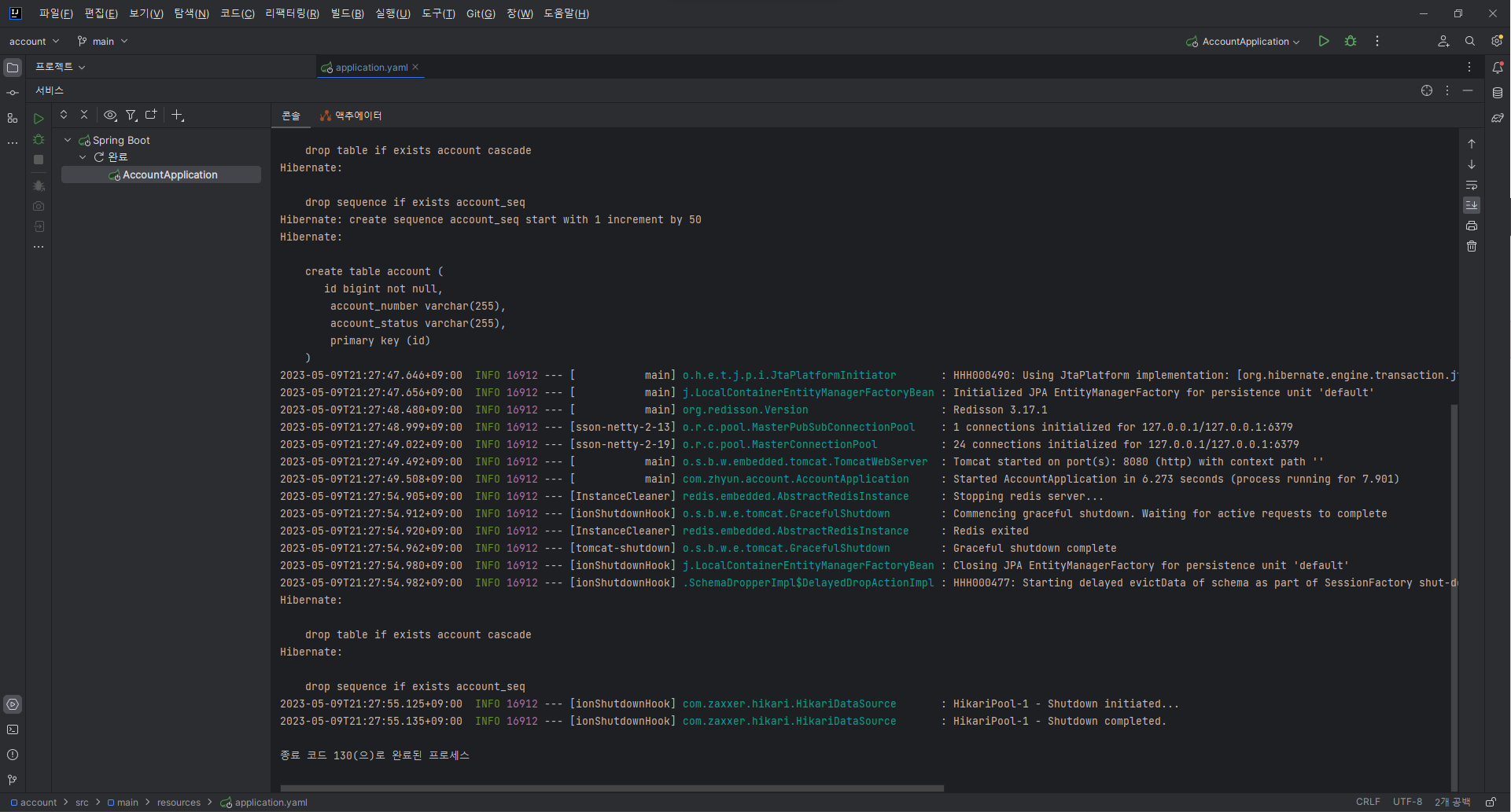 > java -jar .\build\libs\account-0.0.1-SNAPSHOT.jar이 부분은 컴퓨터 처음 부팅하고 인텔리제이 실행 했을때만 입력해주면 두 번째부터는 방향키로 명령어 재실행 할 수 있어서 괜찮은것 같다. 🤔