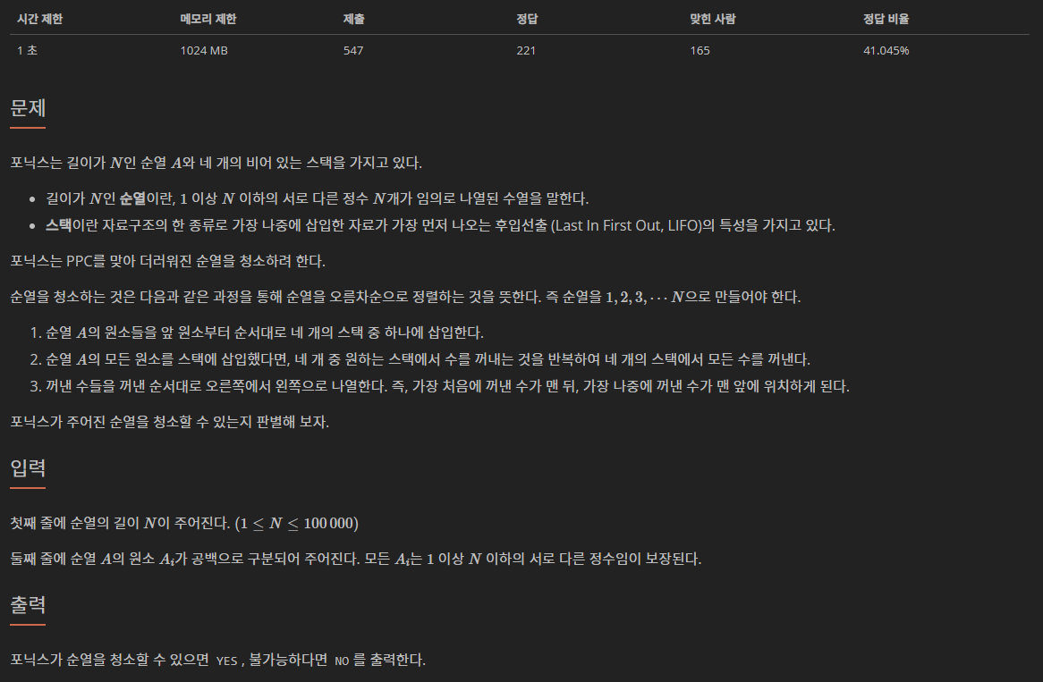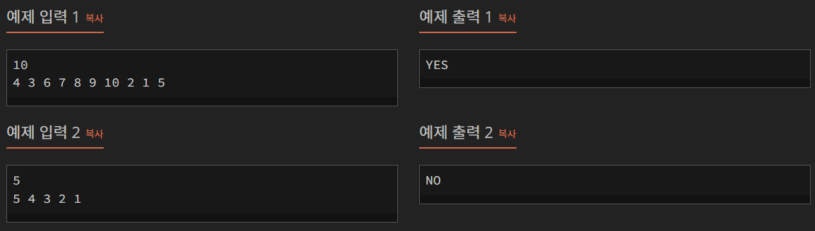 import java.io.BufferedReader; import java.io.IOException; import java.io.InputStreamReader; import java.util.StringTokenizer; public class Main { public static void main(String[] args) throws IOException { BufferedReader br = new BufferedReader(new InputStreamReader(System.in)); int N = Integer.parseInt(br.readLine()); StringTokenizer st = new StringTokenizer(br.readLine(), " "); int[] stack = new int[]{0, 0, 0, 0}; int value; boolean isPossible = true; while (isPossible && st.hasMoreTokens()) { value = Integer.parseInt(st.nextToken()); isPossible = false; for (int i = 0; i < stack.length; i++) { if (stack[i] < value) { stack[i] = value; isPossible = true; break; } } } if (isPossible) System.out.println("YES"); else System.out.println("NO"); } }1. 사용될 변수 선언 & 초기화