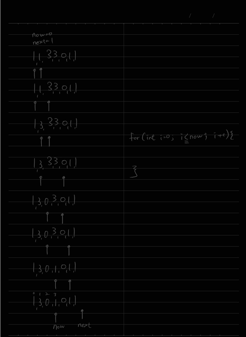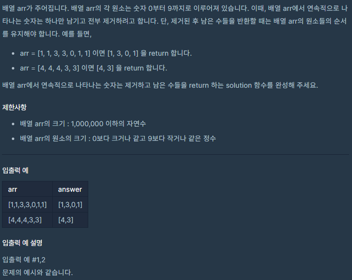 int idx = 0; for (int n: arr) { if (idx == 0 || n != arr[idx - 1]) arr[idx++] = n; }idx가 0 이거나, n이 이전 숫자와 다르면 arr[idx]에 n 입력하고 idx += 1