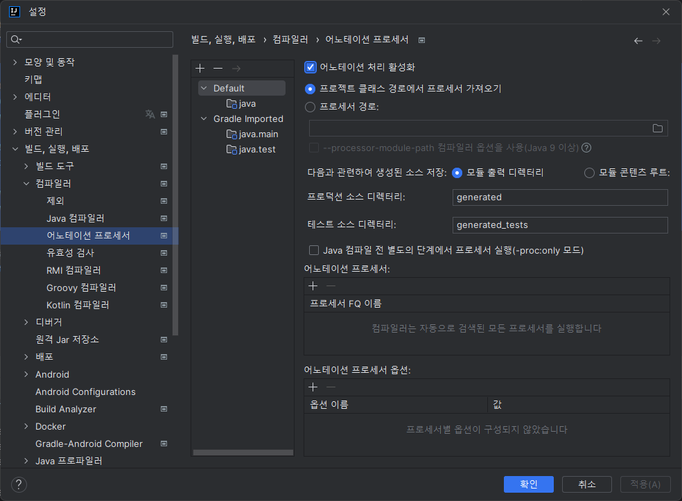ctrl+alt+s눌러서설정실행 후빌드, 실행, 배포-컴파일러-어노테이션 프로세서누르면 나오는 설정 맨 위에어노테이션 처리 활성화체크 해줘야 됨+ 😠 혹시 lombok 추가 후 콘솔에서 갑자기 한글이 깨진다면..