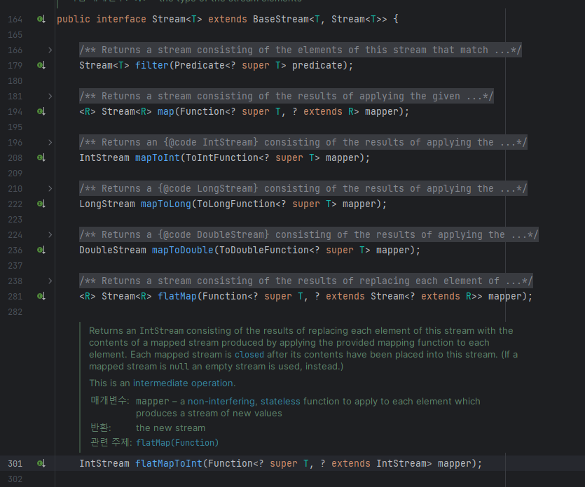 IntStream flatMapToInt(Function<? super T, ? extends IntStream> mapper);T를 입력받아서 하나의IntStream을 반환하는 메서드이다.이 말은 T가 분명히 1개 이상 들어올테니 IntStream도 1개 이상이 될 건데, 이