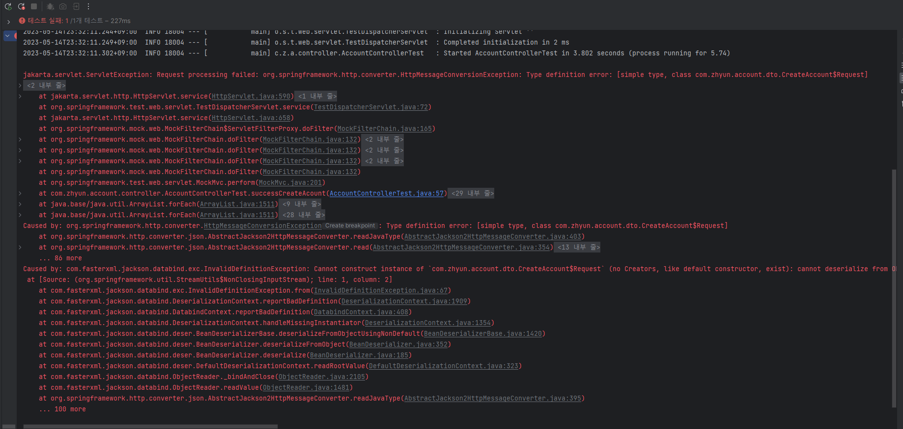 dto.CreateAccount$Request클래스에 기본 생성자가 없어서 난 에러였다.ObjectMapper가 @RequestBody를 바인딩할 때 기본 생성자를 사용하기 때문에, ObjectMapper를 사용할 때는 사용할 객체에 기본 생성자를 선언해주어야 한다.