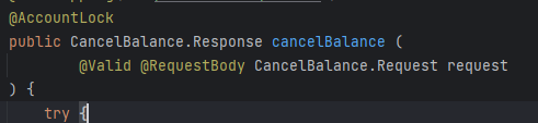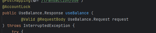 그렇기 때문에, 이 어노테이션을 사용하는 메서드에서는 AccountLockIdInterface 를 구현한 객체가 명시 되어 있어야 한다.