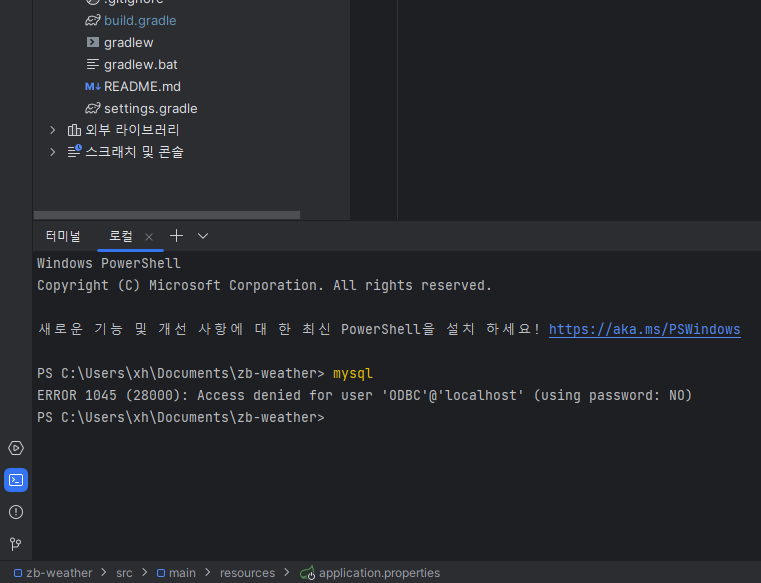 터미널 껐다 켰다 껐다 켰다 껐다 켰다 껐다 켰다 반복해봤는데 mysql 명령어가 안먹길래 인텔리제이를 껐다가 켰더니 명령어가 먹혔다..