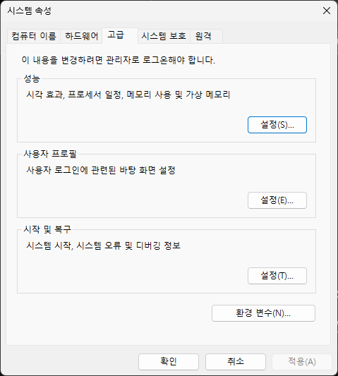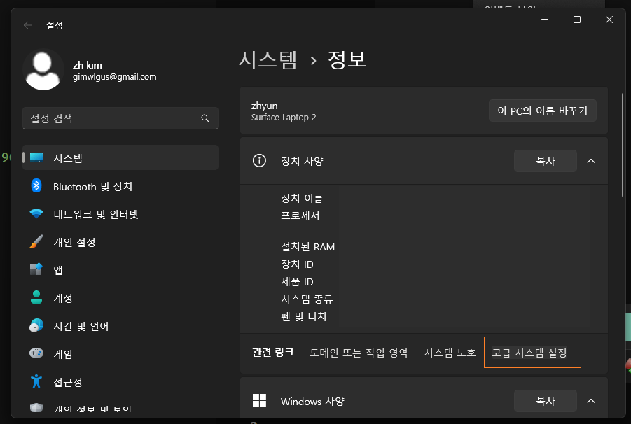2. 고급 시스템 설정 진입