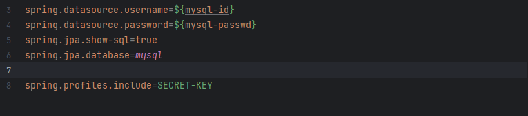 application-관리할이름.properties파일을 include 시켜준다.spring.profiles.include=관리할이름형태로 작성하면 된다.spring.profiles.include=SECRET-KEY그리고 application-관리할이름.properties 안에 작성한 키를 사용하려면