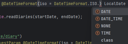 void getDate( @RequestParam @DateTimeFormat(iso = DateTimeFormat.ISO.DATE) LocalDate date ) { System.out.println(date); }만약 controller에서 dateFormat으로 지정한 형태와 다른 형태인 데이터를 보내면 에러남!