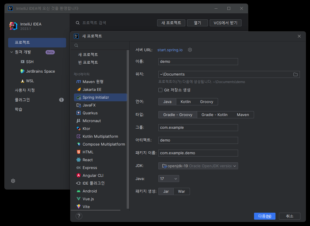 인텔리제이 IDEA 에서 곧바로 스프링 프로젝트를 생성할 수 있다.