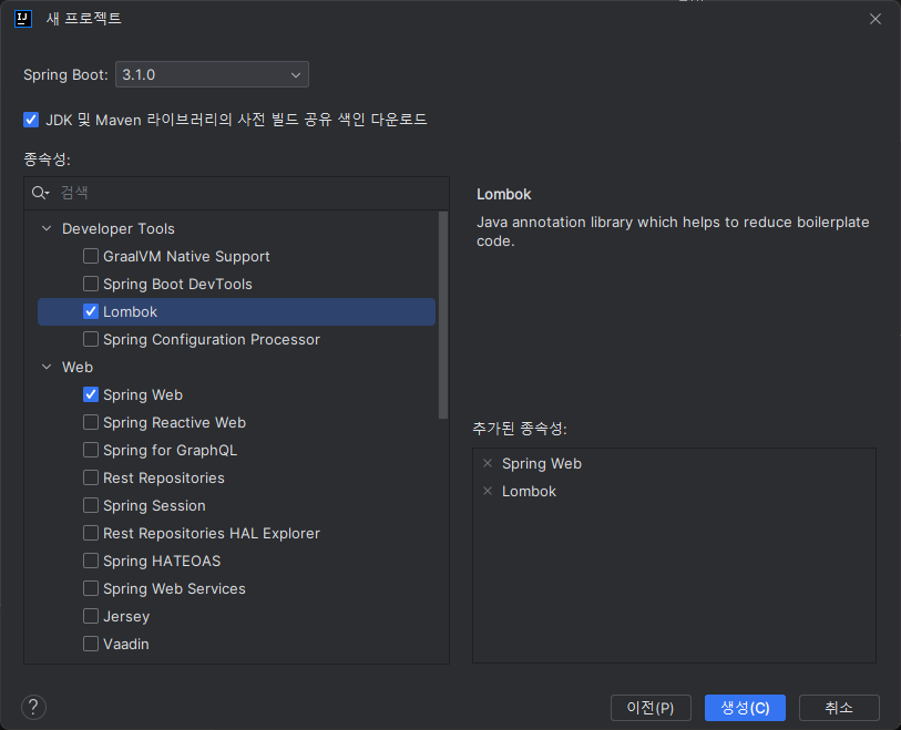 🔻 다음 화면에서 스프링 버전 선택(필수)와 의존성 도구들을 추가(선택)할 수 있다.