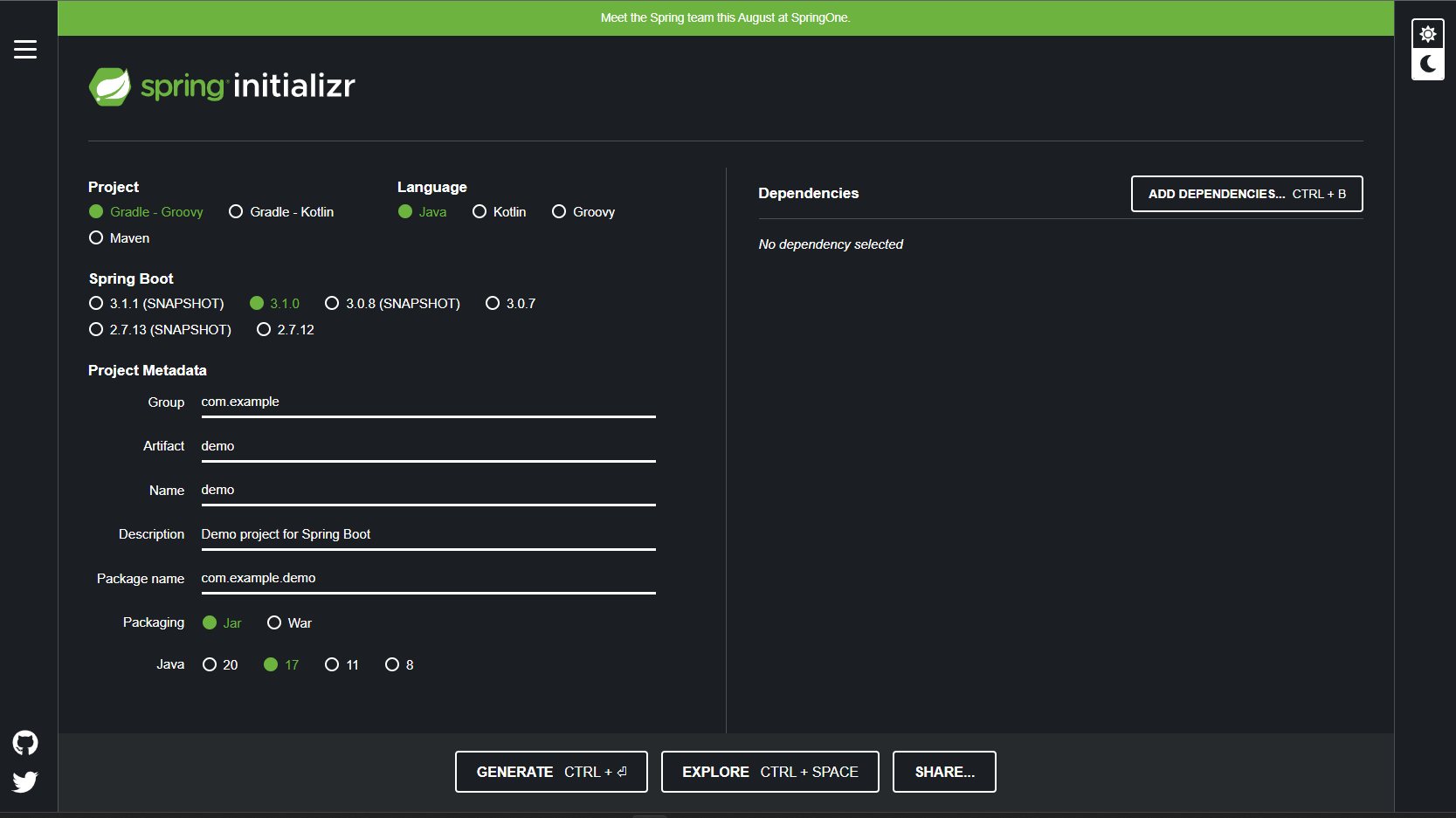 공식 사이트에서 프로젝트 정보를 설정한 후 다운 받아서 사용할 수 있게 되어있다.