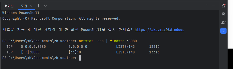 netstat -ano | findstr :8080이걸로 죽이면 됨