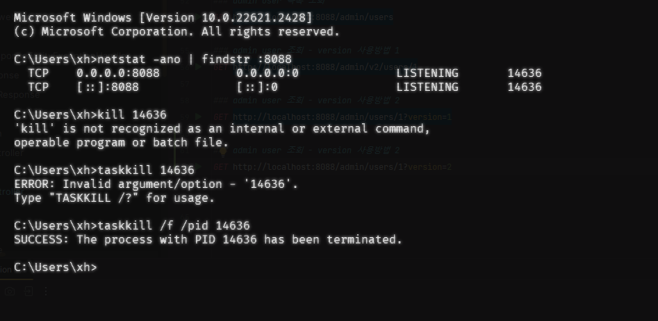 netstat -ano | findstr :8080이걸로 죽이면 됨