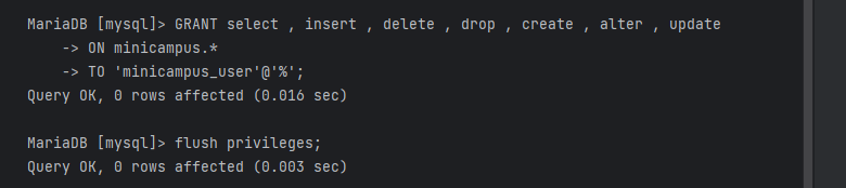 GRANT select , insert , delete , drop , create , alter , update ON minicampus.* TO 'minicampus_user'@'%';확인!