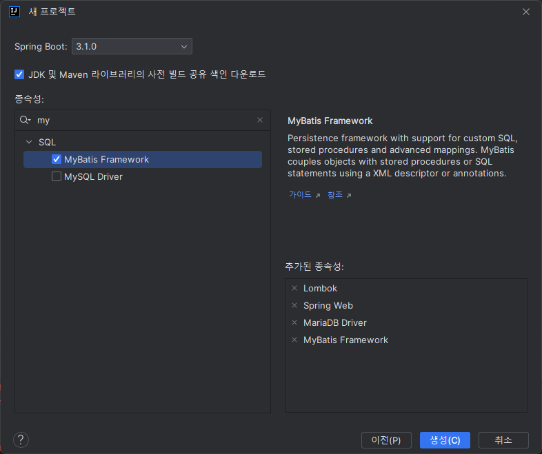 maria db를 사용해서 MyBatis를 학습하기 위해 의존성을 추가해서 프로젝트를 만들었다.