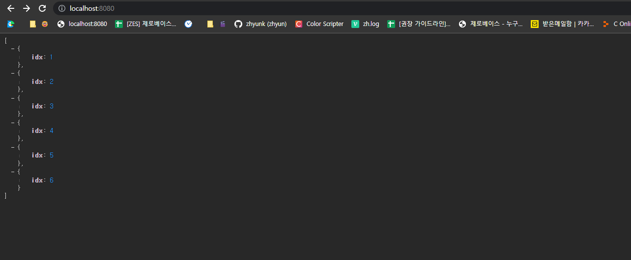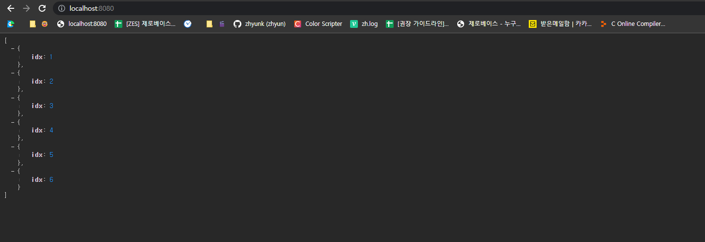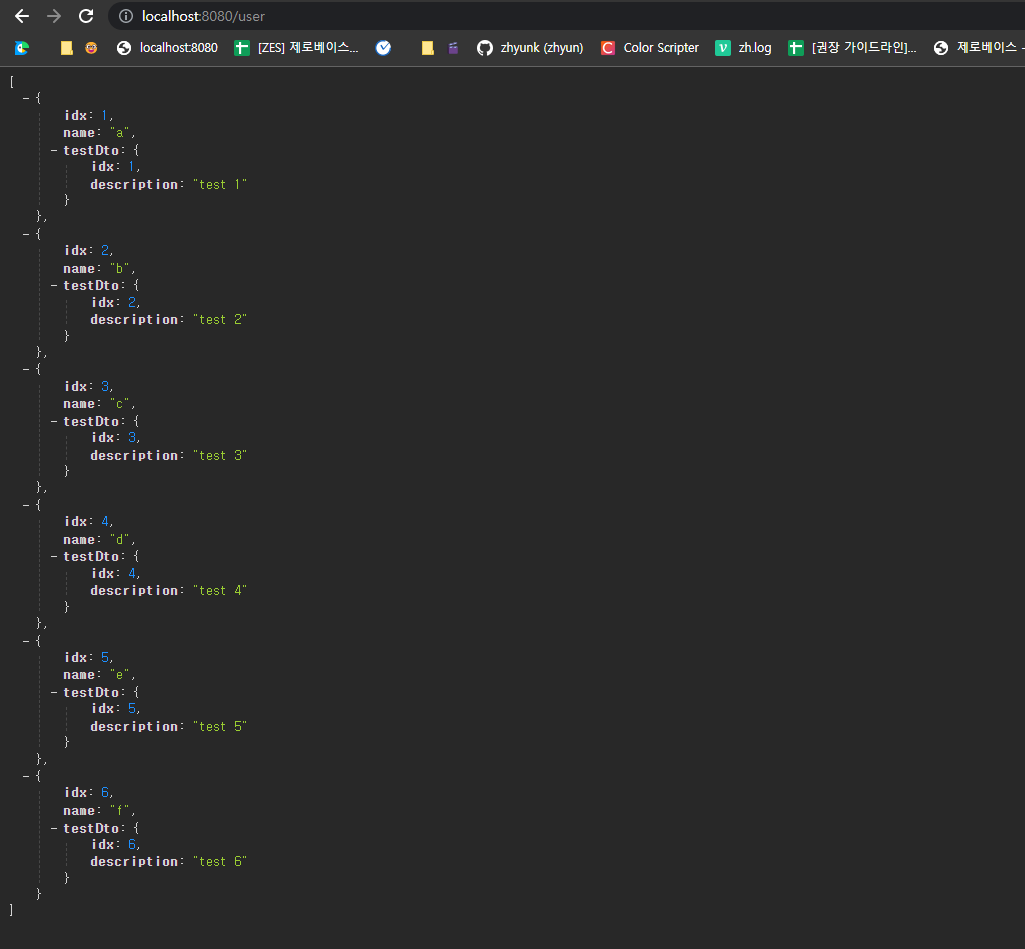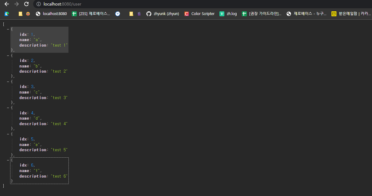 @AllArgsConstructor @RestController public class TestController { TestService service; @GetMapping("/") public List<TestDto> get1() { return service.findAll(); } @GetMapping("/{idx}") public TestDto get2(@PathVariable int idx) { return service.findByState(idx); } }db 값 입력