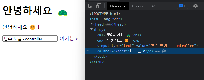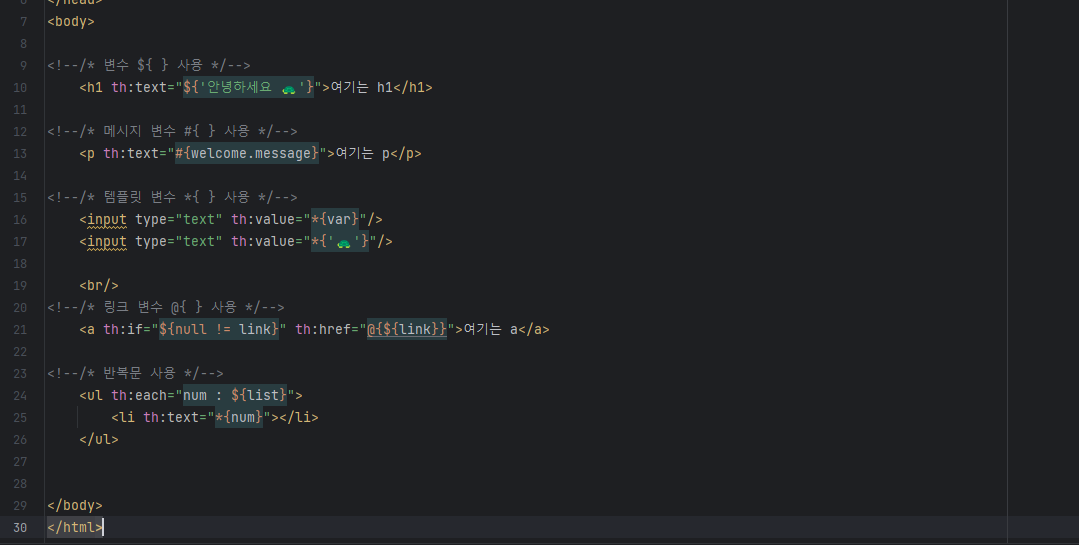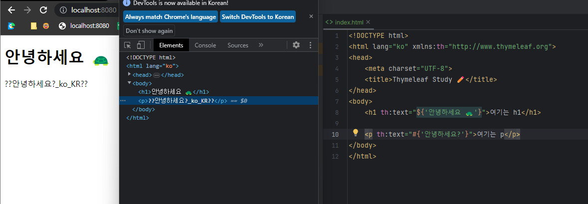 <!DOCTYPE html> <html lang="ko" xmlns:th="http://www.thymeleaf.org"> <head> <meta charset="UTF-8"> <title>Thymeleaf Study ✏️</title> </head> <body> <h1 th:text="${'안녕하세요 🐢'}"></h1> </body> </html>