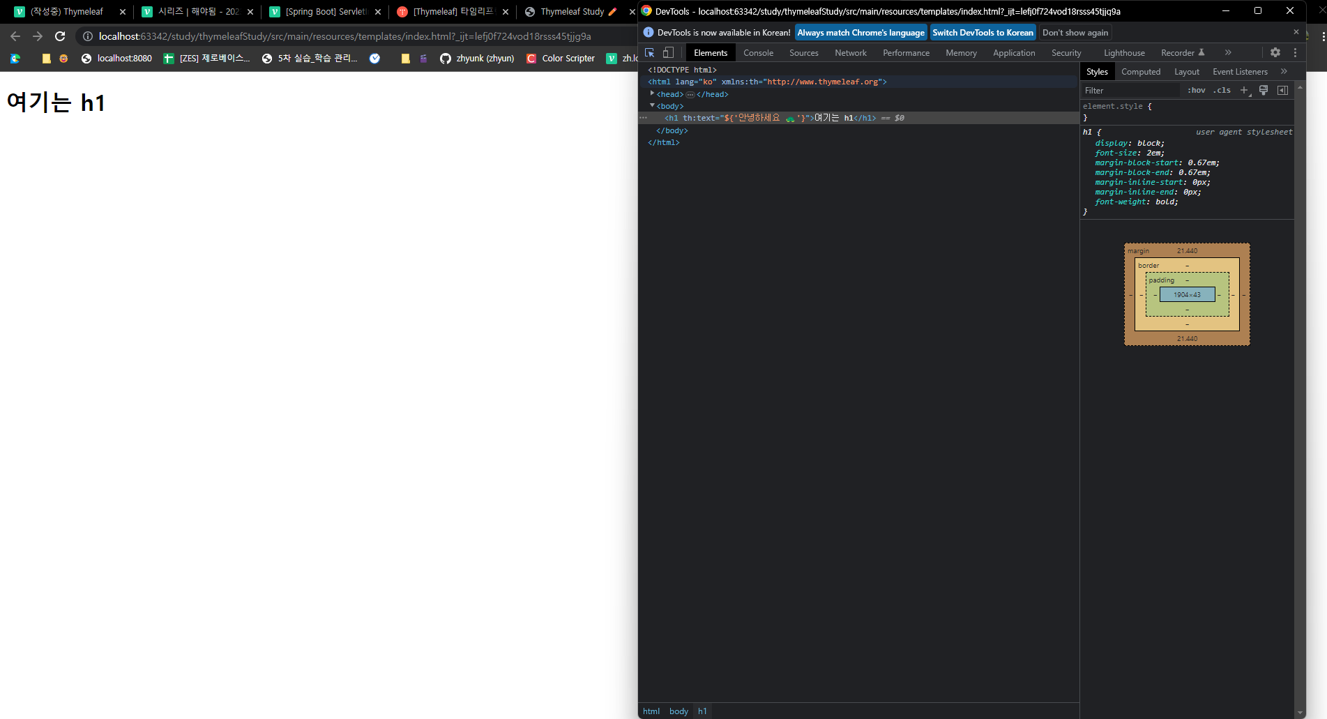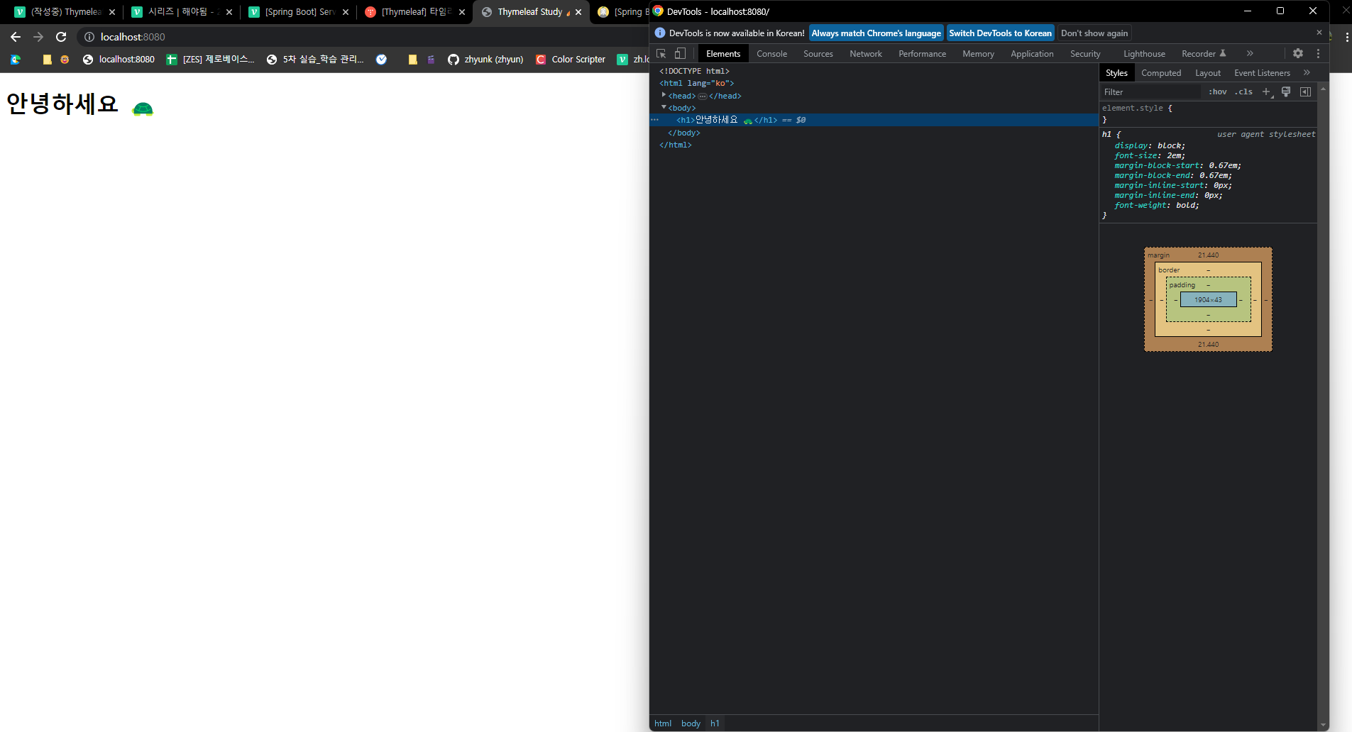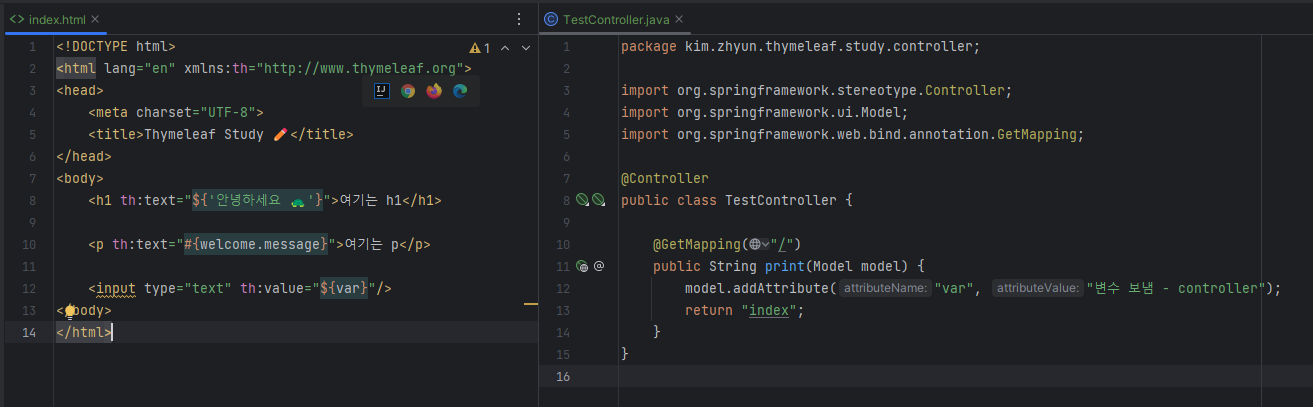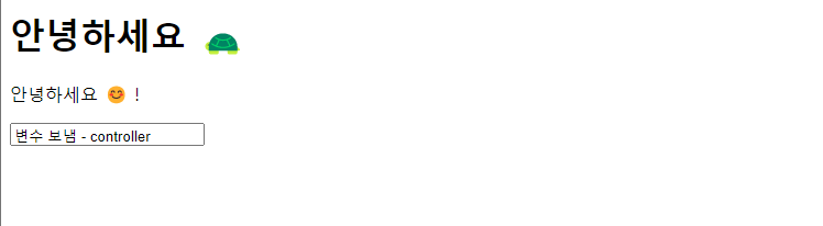 <!DOCTYPE html> <html lang="ko" xmlns:th="http://www.thymeleaf.org"> <head> <meta charset="UTF-8"> <title>Thymeleaf Study ✏️</title> </head> <body> <h1 th:text="${'안녕하세요 🐢'}"></h1> </body> </html>
