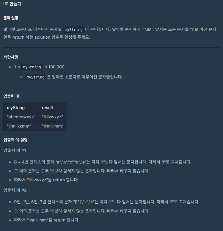import java.util.stream.Collectors; class Solution { public String solution(String myString) { return myString .chars() .mapToObj(c -> String.valueOf(c < 'l' ? 'l' : (char) c)) .collect(Collectors.joining()); } }다른 사람 풀이 - stream