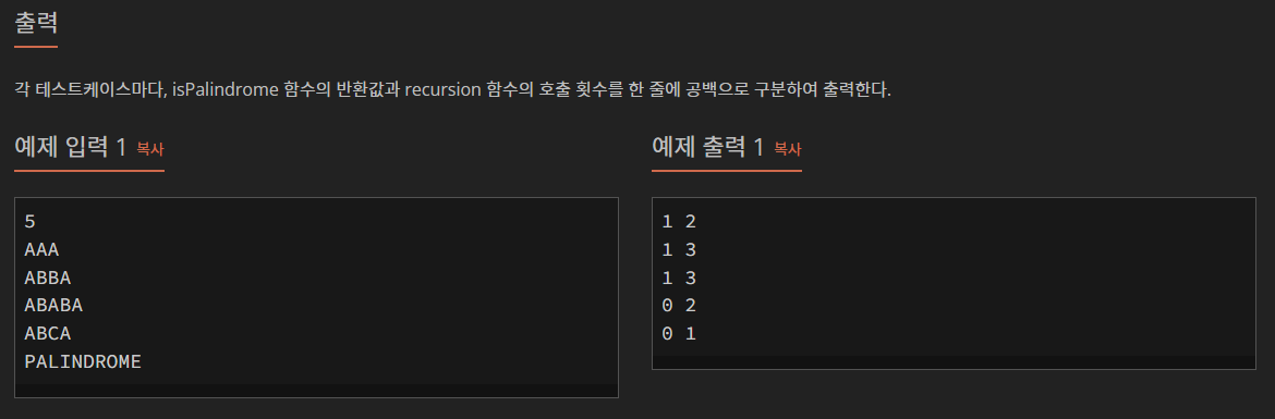 import java.util.Scanner; public class Boj25501 { private static int cnt; public static void main(String[] args) { Boj25501 b = new Boj25501(); Scanner scan = new Scanner(System.in); int T = scan.nextInt(); while (T-- > 0) { String S = scan.next(); System.out.println(b.isPalindrome(S) + " " + cnt); } } private int recursion(char[] s, int l, int r) { cnt++; if (l >= r) return 1; if (s[l] != s[r]) return 0; return recursion(s, l + 1, r - 1); } private int isPalindrome(String s) { cnt = 0; return recursion(s.toCharArray(), 0, s.length() - 1); } }문제에서 답을 알려주었기 때문에 내가 풀었다고 하기도 조금 그렇지만 풀이를 시도해보면서 재귀적 접근 방식에 대해 얻은 부분이 컸다고 생각한다!