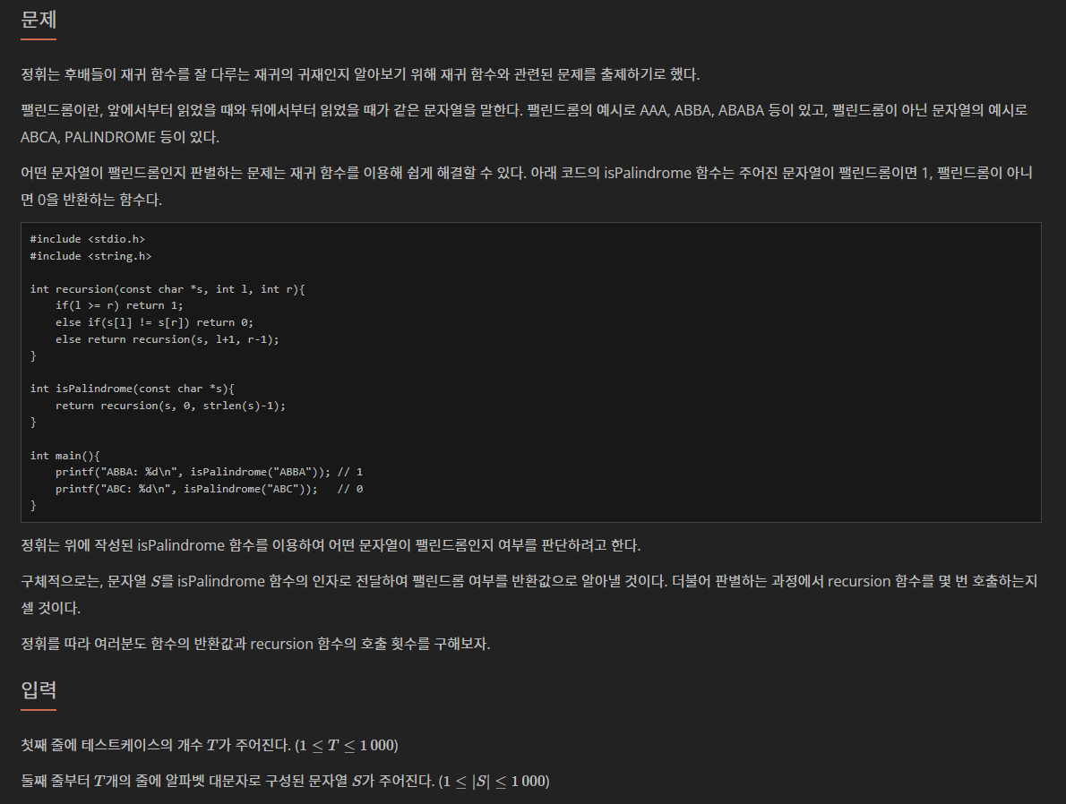 import java.util.Scanner; public class Boj25501 { private static int cnt; public static void main(String[] args) { Boj25501 b = new Boj25501(); Scanner scan = new Scanner(System.in); int T = scan.nextInt(); while (T-- > 0) { String S = scan.next(); System.out.println(b.isPalindrome(S) + " " + cnt); } } private int recursion(char[] s, int l, int r) { cnt++; if (l >= r) return 1; if (s[l] != s[r]) return 0; return recursion(s, l + 1, r - 1); } private int isPalindrome(String s) { cnt = 0; return recursion(s.toCharArray(), 0, s.length() - 1); } }문제에서 답을 알려주었기 때문에 내가 풀었다고 하기도 조금 그렇지만 풀이를 시도해보면서 재귀적 접근 방식에 대해 얻은 부분이 컸다고 생각한다!