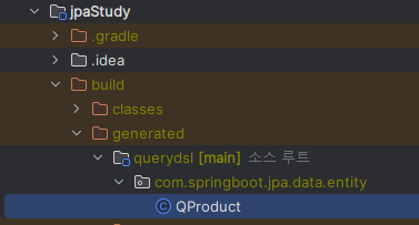 Q도메인 파일은 아래 위치에 있다. jpaStudy - build - generated - querydsl - proj.package.path.data.entity - QProduct.java