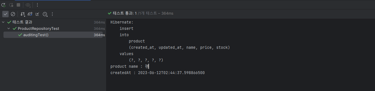 @Autowired ProductRepository productRepository; @Test void auditingTest() { Product product = Product.builder() .name("펜") .price(1000) .stock(100) .build(); Product save = productRepository.save(product); System.out.println("product name : " + save.getName()); System.out.println("createdAt : " + save.getCreatedAt()); }테스트 통과 확인