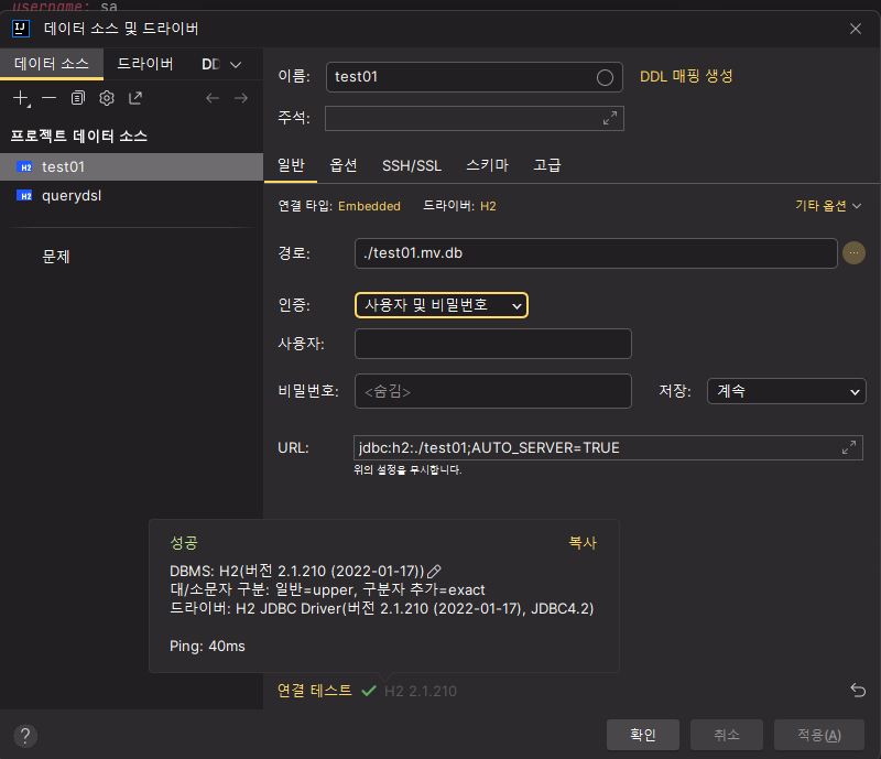 URL 부분에 똑같이 입력해준 다음 연결 테스트 실행 , 성공 시 확인 누름
