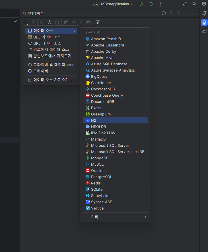 4-1. 데이터베이스 ▸ + ▸ 데이터소스 ▸ H2 선택
