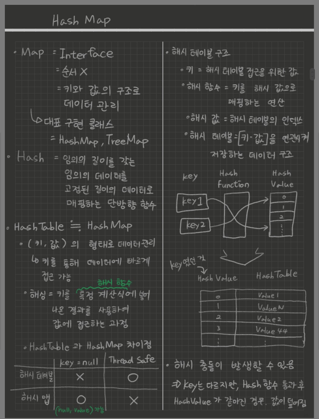 ( 키 , 값 ) = ( null , null ) Thread - safe Hash table X O ( 멀티스레드에서 좋음 ) Hash Map O X ( 싱글스레드에서 성능 좋음) -> 멀티스레드 환경을 위한 ConcurrentHashMap이 있음 - HashMap은 Hashtable로 구현된 자료구조일까?? 아님. 해시테이블 자료구조를 구현하는 자료구조로 hashtable이 처음 등장했고, 그 다음 Java 버전에서 HashMap이 등장했기 때문에 HashMap이 나중에 등장한것도 맞으며, 해시함수를 사용하여 키를 해싱하여 해시테이블에서 키-값 쌍을 관리하는 형태도 같지만, 둘은 해시테이블을 구현하는 자료구조가 다르며, 이때 사용되는 용어도 다르다. 이 둘은 해시테이블 자료구조를 구현한 서로 다른 구현체라고 봐야 한다고 생각한다.