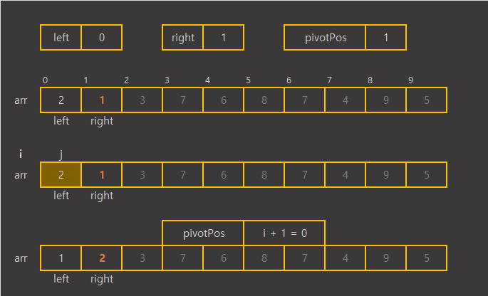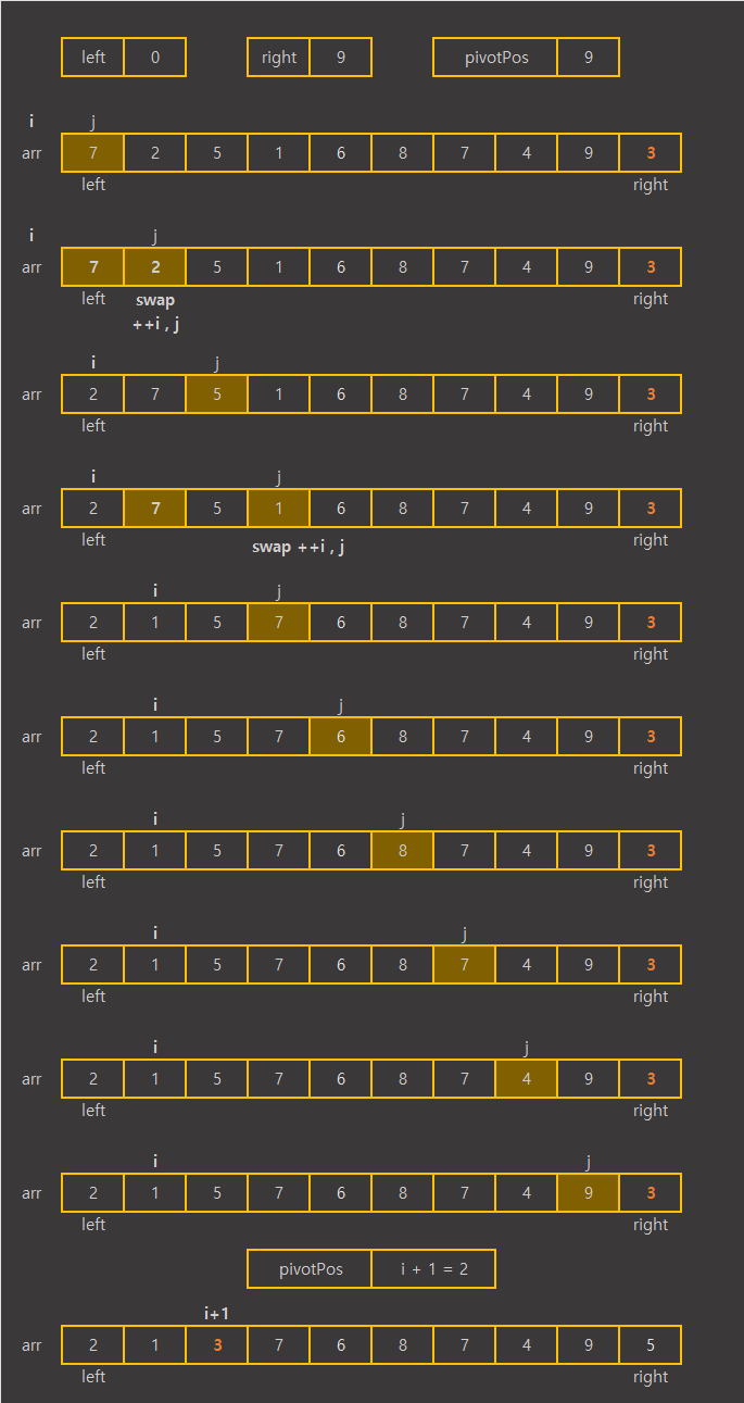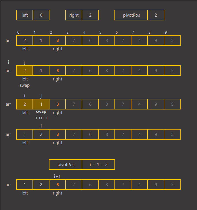 배열 범위 내에서 기준 값인 pivot보다 큰 값이 나오면 지나가고, pivot보다 작은 값이 나오면 i를 1증가시킨 후 i와 교체하며 pivot보다 작은 값들을 배열의 왼쪽 구간에 두게 된다.
