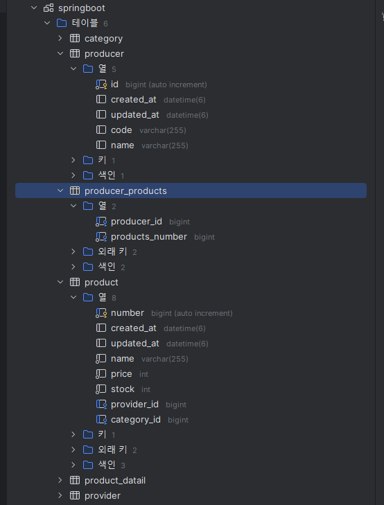@Test @Transactional void relationshipTest2() { Product product1 = saveProduct("두꺼비", 500, 1000); Product product2 = saveProduct("원숭이", 100, 2000); Product product3 = saveProduct("살빼지마 두꺼비ㅠ", 150, 3000); Producer producer1 = saveProducer("jinro"); Producer producer2 = saveProducer("眞露"); producer1.addProduct(product1); producer1.addProduct(product2); producer2.addProduct(product2); producer2.addProduct(product3); product1.addProducer(producer1); product2.addProducer(producer1); product2.addProducer(producer2); product3.addProducer(producer2); producerRepository.saveAll(Lists.newArrayList(producer1, producer2)); productRepository.saveAll(Lists.newArrayList(product1, product2)); producerRepository .findById(1L) .get() .getProducts() .forEach(product -> System.out.println( "[ product ]___________🚩 " + product )); productRepository .findById(2L) .get() .getProducers() .forEach(producer -> System.out.println( "[ producer ]___________🚩 " + producer )); } private Producer saveProducer(String name) { return producerRepository.save(Producer.builder().name(name).build()); } private Product saveProduct(String name, int price, int stock) { return productRepository.save( Product.builder() .name(name) .price(price) .stock(stock) .build() ); }