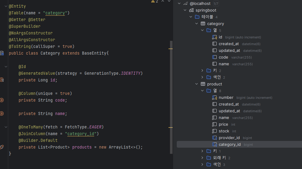 public class Provider extends BaseEntity{ @Id @GeneratedValue(strategy = GenerationType.IDENTITY) private Long id; private String name; @OneToMany( mappedBy = "provider", fetch = FetchType.EAGER, cascade = CascadeType.PERSIST, orphanRemoval = true // 이 부분 추가 ) @Builder.Default @ToString.Exclude List<Product> productList = new ArrayList<>(); }
