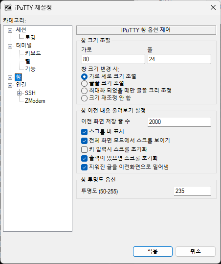 ^ 투명도 230 적용해보기 -> 집에 있는 Putty랑 회사에서 쓰는 Putty랑 버전이 다른가 투명도 설정하는게 없다 ;;