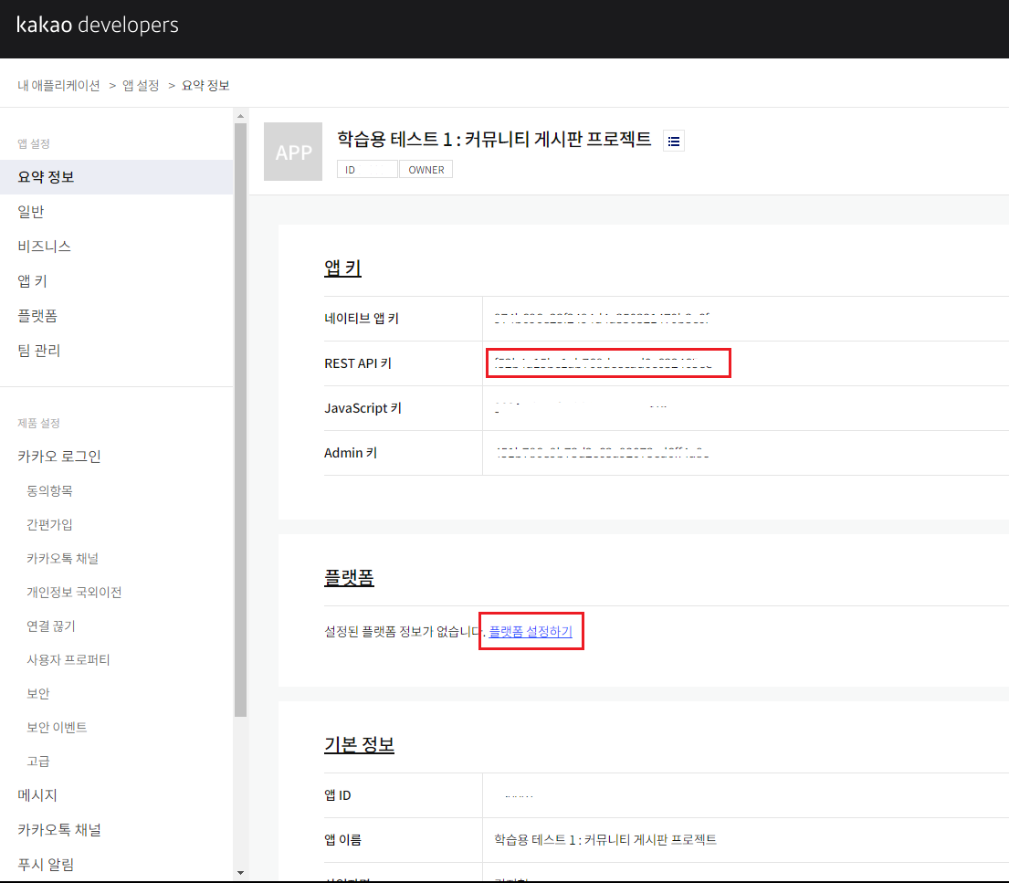 6. REST API 키를 기록해두고, 플랫폼 설정하기 클릭
