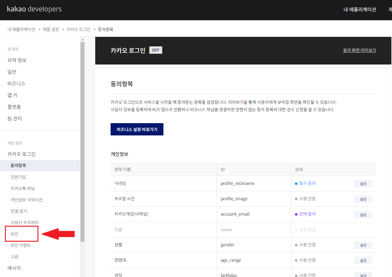 카카오 로그인 api를 통해 받고싶은 정보들을 설정해주어야 한다. 왼쪽 네비게이션 메뉴에서 카카오 로그인 -