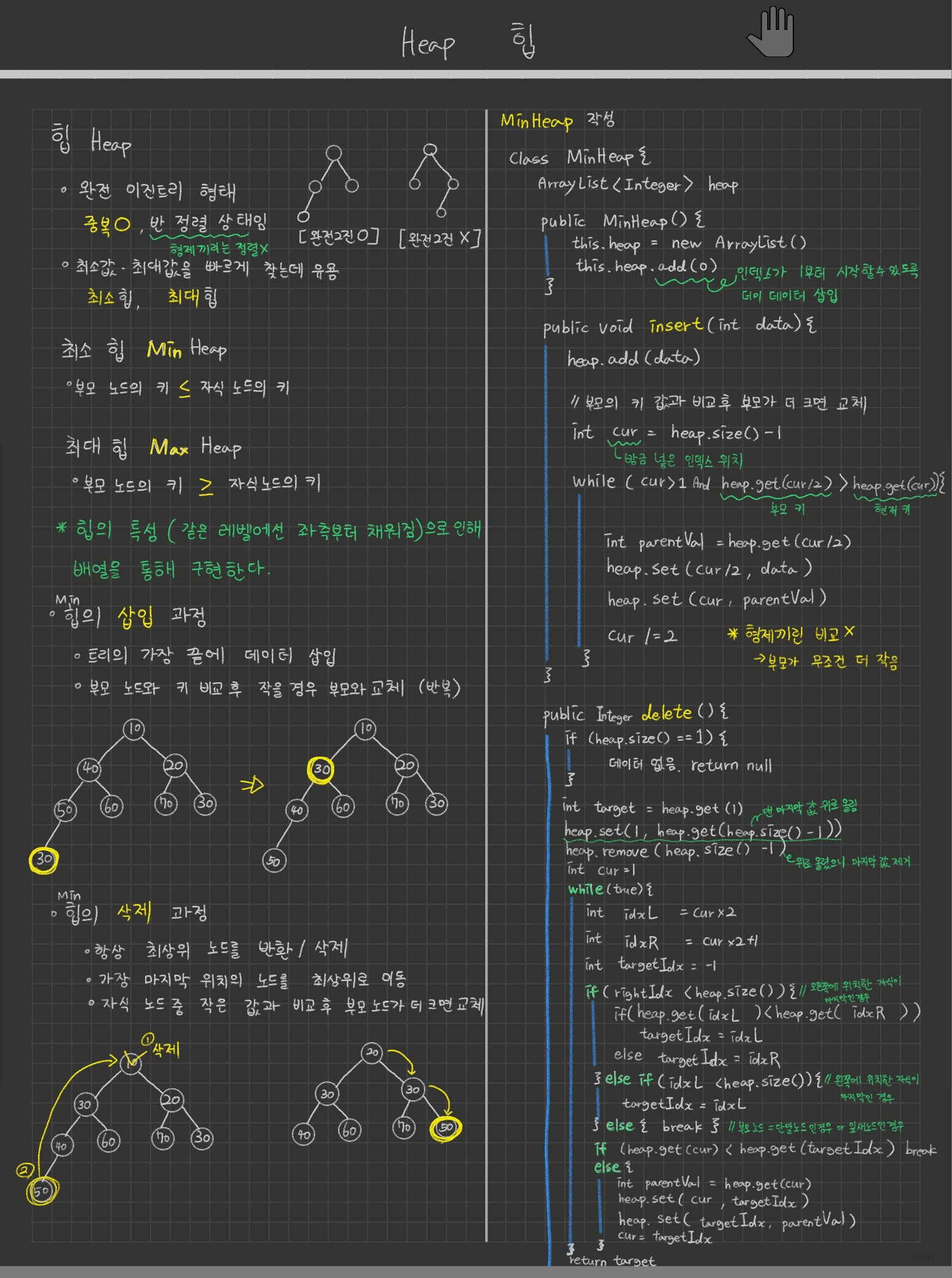 • 최소값, 최대값을 빠르게 찾는데 유용 -> 최소힙 Min Heap , 최대힙 Max Heap -> 최소힙 : 부모 노드의 키 ≤ 자식 노드의 키 -> 최대힙 : 부모 노드의 키 ≥ 자식 노드의 키
