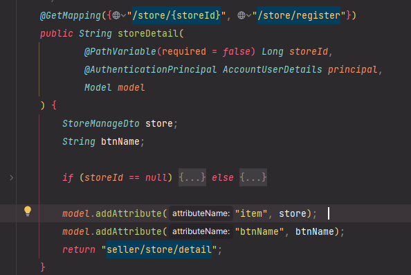 이때, 어노테이션의 인자로는 메서드 호출 시 view에 전달 할