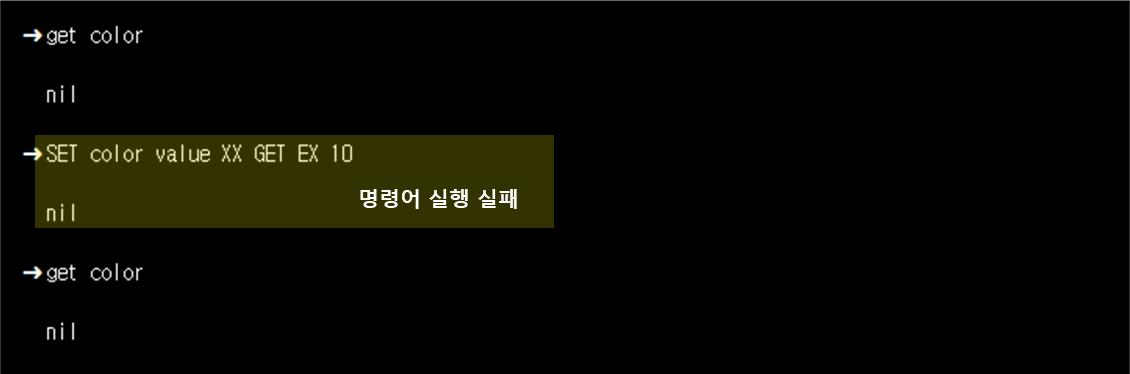 값이 없는 key 를 GET 명령어로 호출하면 nil 을 반환한다.